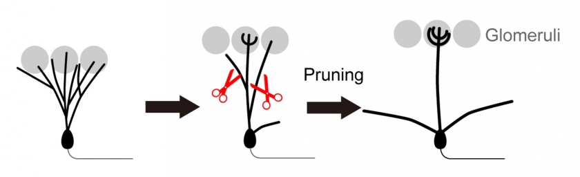 "We decided to investigate what exactly happens in neurons during remodeling, so, we looked into using mouse mitral cells, a type of cell housed in the olfactory bulb, the brain center involved in our sense of smell. In adults, mitral cells have a single connection to a signaling waystation called the glomerulus. But in early development mitral cells send branches into many glomeruli," states Fujimoto. "As time progresses, these branches get pruned to leave a single strong connection. In the end, the mitral cells can sniff out only a specific type of smell."