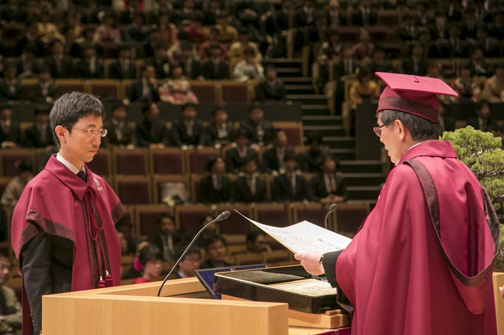 午後からは同会場で大学院の学位記授与式が行われ、修士学位記、専門職学位記、博士学位記が各総代に授与され、2,256名が大学院を修了しました。