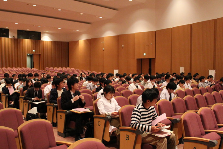 医学系学府入学式の冒頭で住本英樹学府長は、「是非、自分で面白いと思える問題に、あるいは、常識を疑いながら、より根本的な問題に果敢にチャレンジしてほしいと思います。その姿勢があれば、世界中の先達によって培われてきた医学・生命科学の膨大な遺産に皆さんの手で追加できるようになるでしょう。皆さんには、この『地道ではあるが実りの多いリレー』へ積極的に参加し、先輩から引き継いだ医学の道に、小さくてもいいから新たな一歩を切り開くような医学研究者になって欲しい」と挨拶を述べました(全文はページ末尾に掲載)。また、学府長挨拶に続き、医療経営・管理学専攻の鴨打正浩専攻長からも挨拶がありました。その後、事務より履修登録などの説明があり、式の後は専攻に分かれてカリキュラム説明がありました。