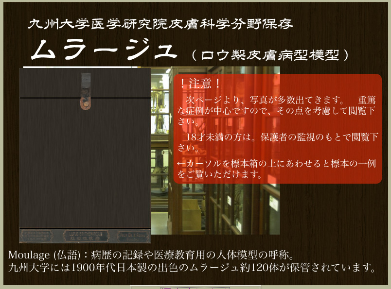 九州大学総合研究博物館のウェブサイトのコンテンツである 「オンライン博物館」に、医学研究院皮膚科学分野保存の「ムラージュ(ロウ製皮膚病型模型)」が公開されました。「オンライン博物館」では、自然界、科学研究、大学博物館についての情報をウェブで掲載しており、閲覧の制限なく、一般の方もご覧いただくことができます。