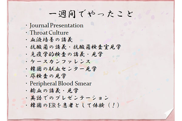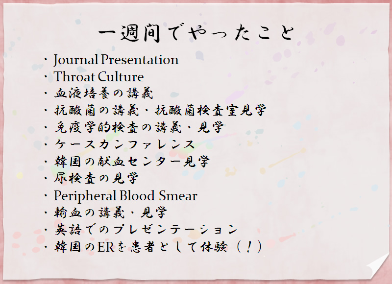 | 学生による英語でのJournal Presentation、血液培養・抗酸菌・免疫学的検査のレクチャー、韓国の献血センターの見学、末梢血塗沫標本の観察、輸血に必要な検査の見学など、九州大学病院検査部で勉強させて頂いたことと合わせて、臨床検査に対する理解をぐっと深めることができました。最終日には、日本の医学部での学生生活の様子や卒業後の進路について英語でプレゼンをする機会を与えて頂きました。 また、慶尚大学では毎日、3・4年生合同のケースカンファレンスがあり、私も参加させて頂きました。レジデントの先生が症例発表を進め、学生が先生の質問に答えるという形式でした。ケースカンファレンスは韓国語で進められましたが、スライドが英語だったのと、周りの学生が英語で先生の言葉を通訳してくれたのもあって、流れはだいたい理解することができました。 |