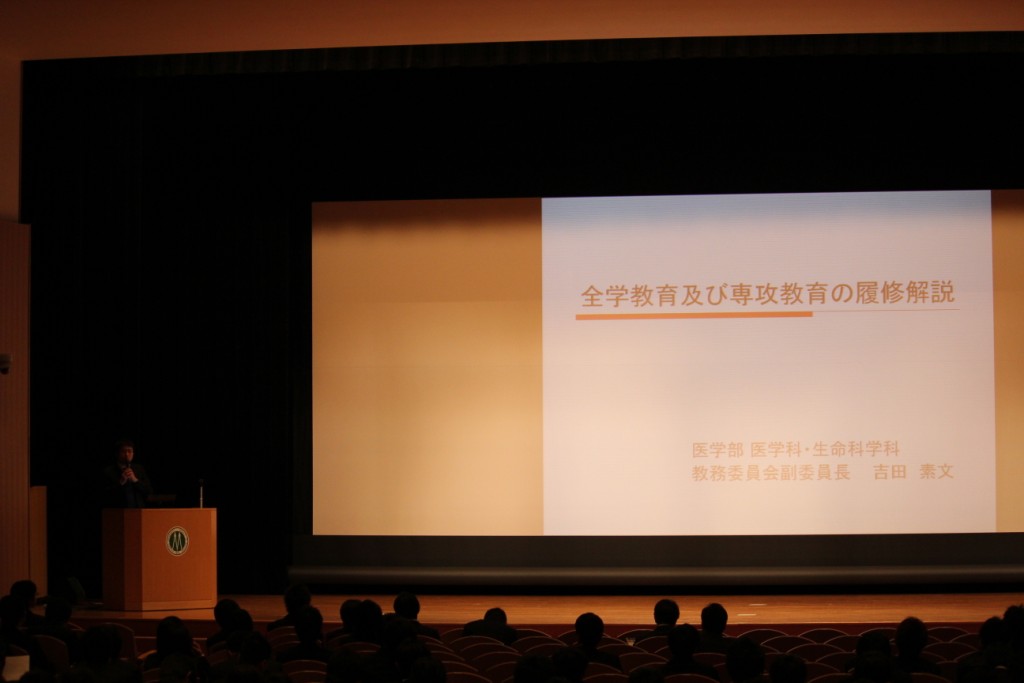 その後、副教務委員長 吉田 素文教授(医学教育学分野)から専攻教育科目共通事項説明及び全学教育履修解説があり、医学学生係から医学部在学中の注意事項等がありました。