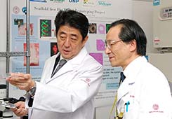 眼科領域の難病に対する遺伝子治療の日本で初めての臨床応用となった石橋達朗眼科学教授の「網膜色素変性症に対する遺伝子治療の臨床研究」や,江頭健輔循環器病先端医療研究開発学教授の「重症肺高血圧症治療用ナノ粒子製剤の実用化と臨床試験」,また,田口智章小児外科学教授から,腸が機能しない難病であるヒルシュスプルング病類縁疾患に対する幹細胞を用いた新しい治療法の開発について説明を受けられ,特に江頭教授からの説明では, 安倍首相自ら実験装置の前に立ち,日本発で世界で初めての心血管病治療用ナノ粒子製剤を手に取って確認されました。