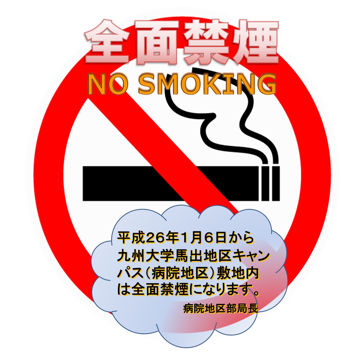 馬出地区キャンパス(病院地区)は、健康増進法に基づく受動喫煙防止の観点から、平成26年 1月 6日(月)から、敷地内を全面禁煙としますので、皆さまのご理解とご協力をよろしくお願い致します。