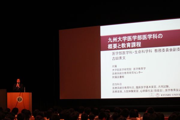 引き続き、医学教育学 吉田素文教授からは、入学後のカリキュラムや、MD-PhDコース、九州大学の基幹教育についてなど、本学における多様な教育システムの説明がありました。最後に、脳神経外科学分野 飯原弘二教授の講話「医学を目指すプレ大人たちへ」がありました。飯原教授は、医師がどのようにスキルを身につけていくのかを、ご自身の留学等の経験の話を例にとり紹介されました。参加者は説明会を通して医学の知識に触れ、新たな刺激となったようでした。