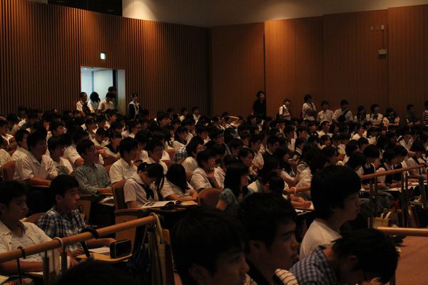医学科の学科説明会では、例年のように会場として、570名を収容できる百年講堂大ホールを準備していましたが、収容定員を大幅に上回る約1,200名に来学して頂いたため、急遽、中ホールも開放し、中ホールではテレビ中継を使用しての開催となりました。