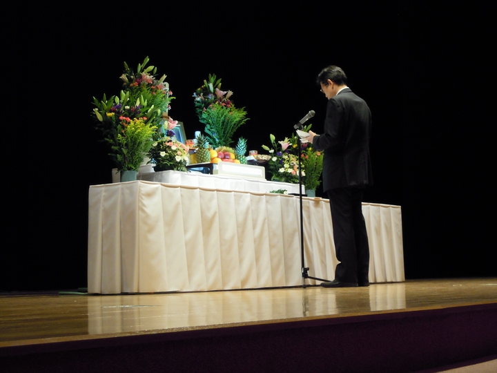 約300名の教職員・学生が参列し、始めに参加者全員で黙祷を行った後、片野研究院長から「慰霊の言葉」が述べられました。引き続き、小野動物実験施設長から弔辞があり、動物実験施設長は「今後とも、動物実験に従事する私達は、国内外の規制の動向や科学的知見に関する情報の収集に努め、3R(代替法の選択、使用数の削減、苦痛の軽減)を実行し、実験動物の福祉の実現に取組む所存である。」と述べられました。