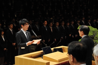 その後、新入生総代の文学部 太郎浦 拓真(たろうら たくま)さんが、「私達は本学教育の趣旨を体して、自立の精神を重んじ、学術を極めるとともに、自ら人格の陶冶に努め、社会の期待に沿うことを誓います。」と誓詞を朗読しました。