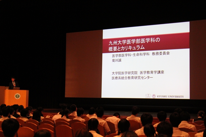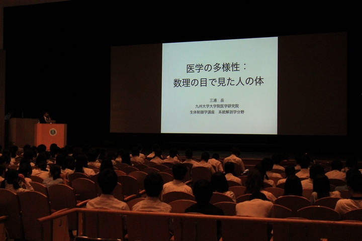引き続き、医学教育学講座 菊川誠講師からは、入学後のカリキュラムや、MD-PhDコース、九州大学の基幹教育についてなど、本学における多様な教育システムの説明がありました。そして最後に、系統解剖学分野 三浦岳教授の講話「医学の多様性:数理の目で見た人の体」があり、三浦教授は、多様な医学部出身者の進路の中でも特殊であるご自身のキャリアについて話され、生物の形作りを数理を使って理解するという現在の研究内容や留学の経験などの話をされました。参加者は説明会を通して医学の知識に触れ、新たな刺激となったようでした。