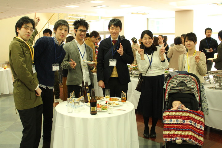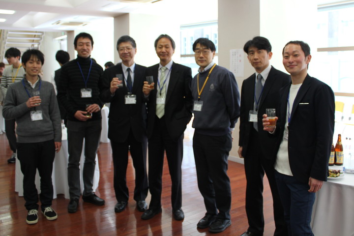 康生命科学科長のご挨拶、乾杯の合図で始まり、卒業生の先輩方は懐かしい友人との会話に終始笑顔をこぼされていました。今回、わざわざ大阪大学からお越しいただいた生体防御医学研究所 山崎晶教授*のご挨拶で会を締めさせて頂き、温かい雰囲気で立食パーティーを終えることができました。