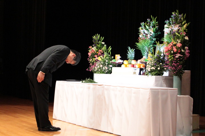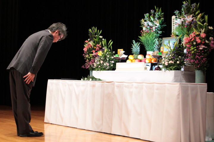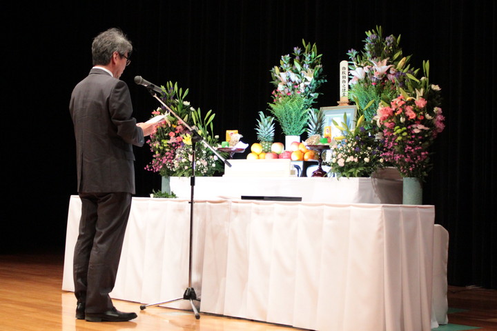 約260名の教職員・学生が参列し、始めに参加者全員で黙祷を行った後、住本研究院長から「慰霊の言葉」が述べられました。引き続き、小野動物実験施設長から弔辞があり、動物実験施設長は「今後とも、動物実験に従事する私達は、国内外の規制の動向や科学的知見に関する情報の収集に努め、3R(代替法の選択、使用数の削減、 苦痛の軽減)と実験動物学の三大統御(環境統御、微生物統御、遺伝統御)を実践することで、 実験動物の福祉の実現と動物実験の再現性確保に取組む所存である。」と述べられました。