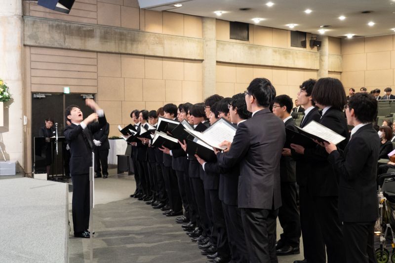 その後、本学の男声合唱団コールアカデミーが鎮魂歌2曲の奉唱を行いました。1曲目の『薔薇ノ木ニ薔薇ノ花サク』は、北原白秋の詩集「白金の独楽」に収められている詩で、「薔薇の木に 薔薇の花咲く 何事の不思議なけれど」という詩に、命が生まれ・受け継がれていくことの神秘や感動が込められています。2曲目には『ヒポクラテスの歌』が奉唱されました。ヒポクラテスはギリシア時代の医師で医学の神様とされており、命を尊び、医学への畏敬の念や、医学を信じ、それに従うことの厳粛な決意を詠っています。2曲ともコールアカデミーの前常任指揮者であり、自らもご献体をなさった、故 藤井凡大先生の作曲です。