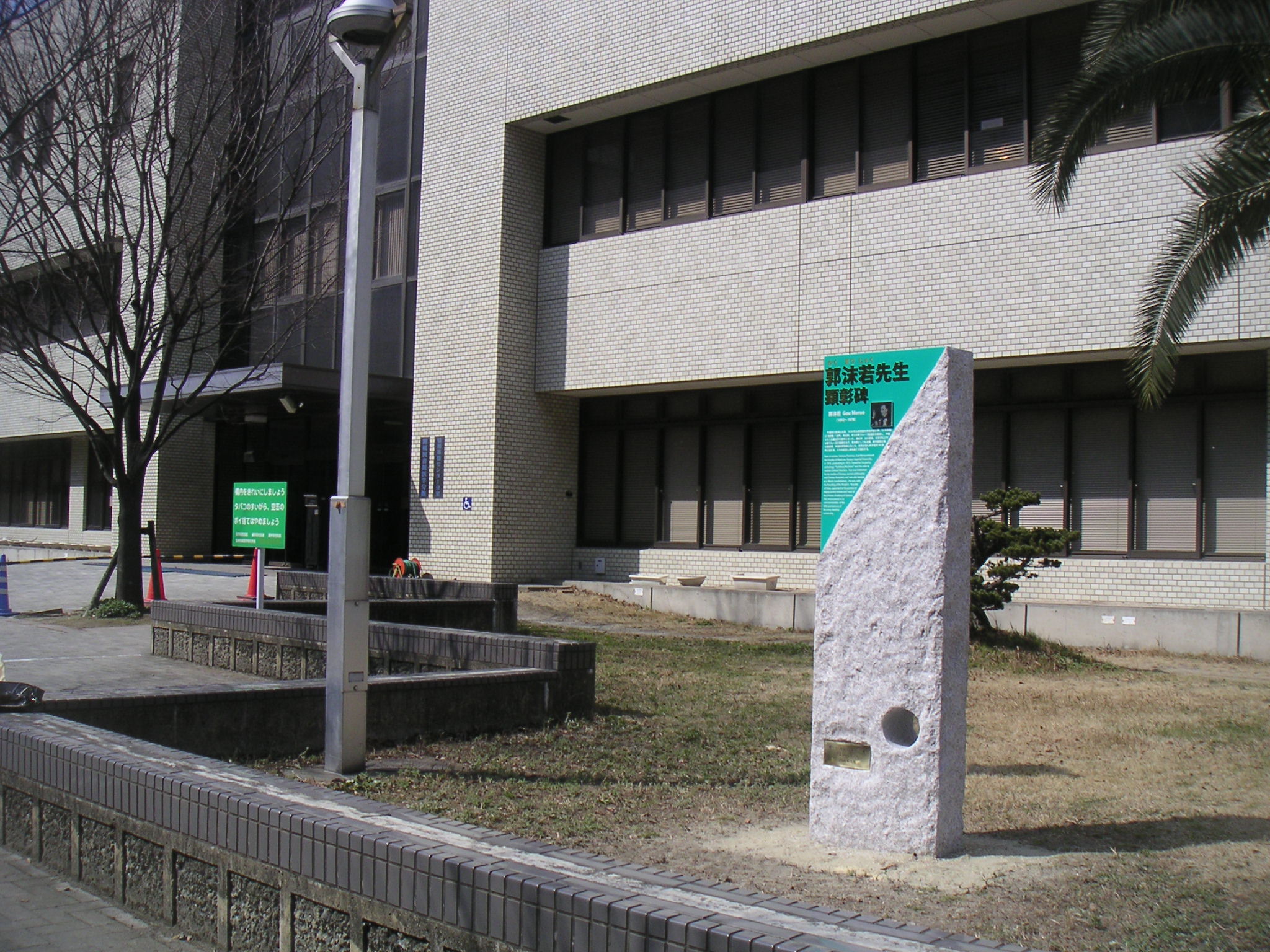 郭沫若は三度来日している。三度目は1955年(昭和30年)、国務院副総理兼科学院長として学術視察団を率いてきた。九大医学部でも講演し、当時世話役の学生代表だったのが杉岡洋一前九大総長。杉岡氏ら九大医学部を昭和33年に卒業した同期会「燦燦会」が、「歴史を伝えたい」と卒後50年に当たる記念事業として、この顕彰碑を建立した。