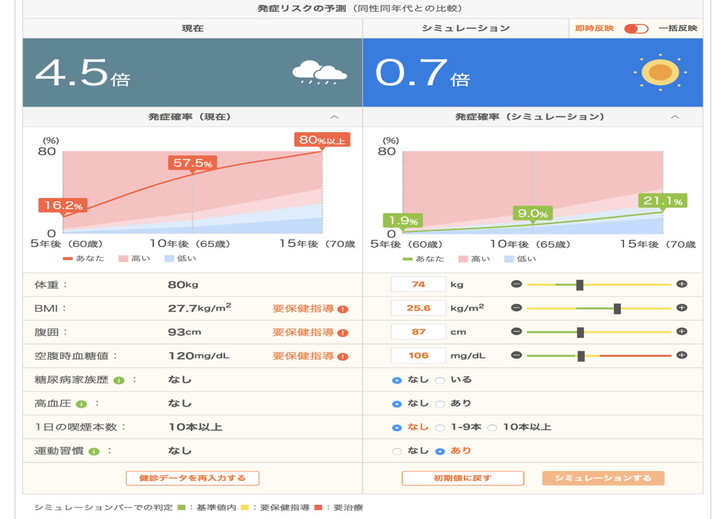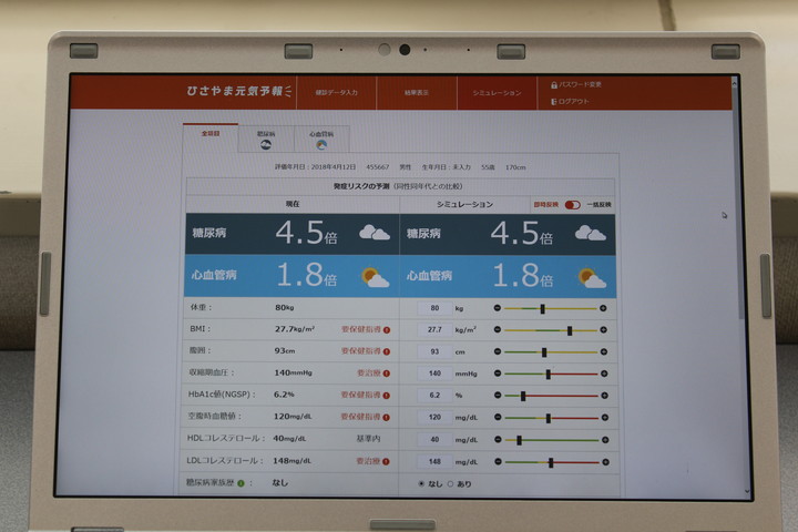 久山町の生活習慣病予防健診では、通常の健診では行わない詳細な検査も行うのですが、「ひさやま元気予報」では、あえてそのような項目は使用せず、ごく一般的な健診項目のみで使用できるようになっており、久山町民以外の方の使用も視野に入れたものとなっています。(計算式は、久山町での健診項目を基礎として算出されており、それによってより正確な計算結果を導けるようになっています。)