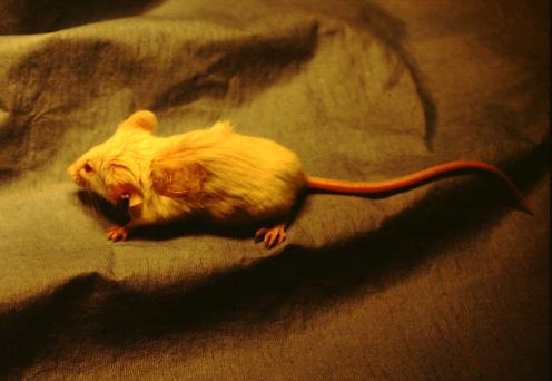 突然変異で産まれた免疫不全のマウスの背に、ブタの皮膚片を移植したが、マウスには免疫能をつかさどるT細胞・B細胞がないので異種移植片を拒絶しない。(1992年、富田助教授がハーバード大付属マサチューセッツ総合病院留学時代に、自ら移植した写真)