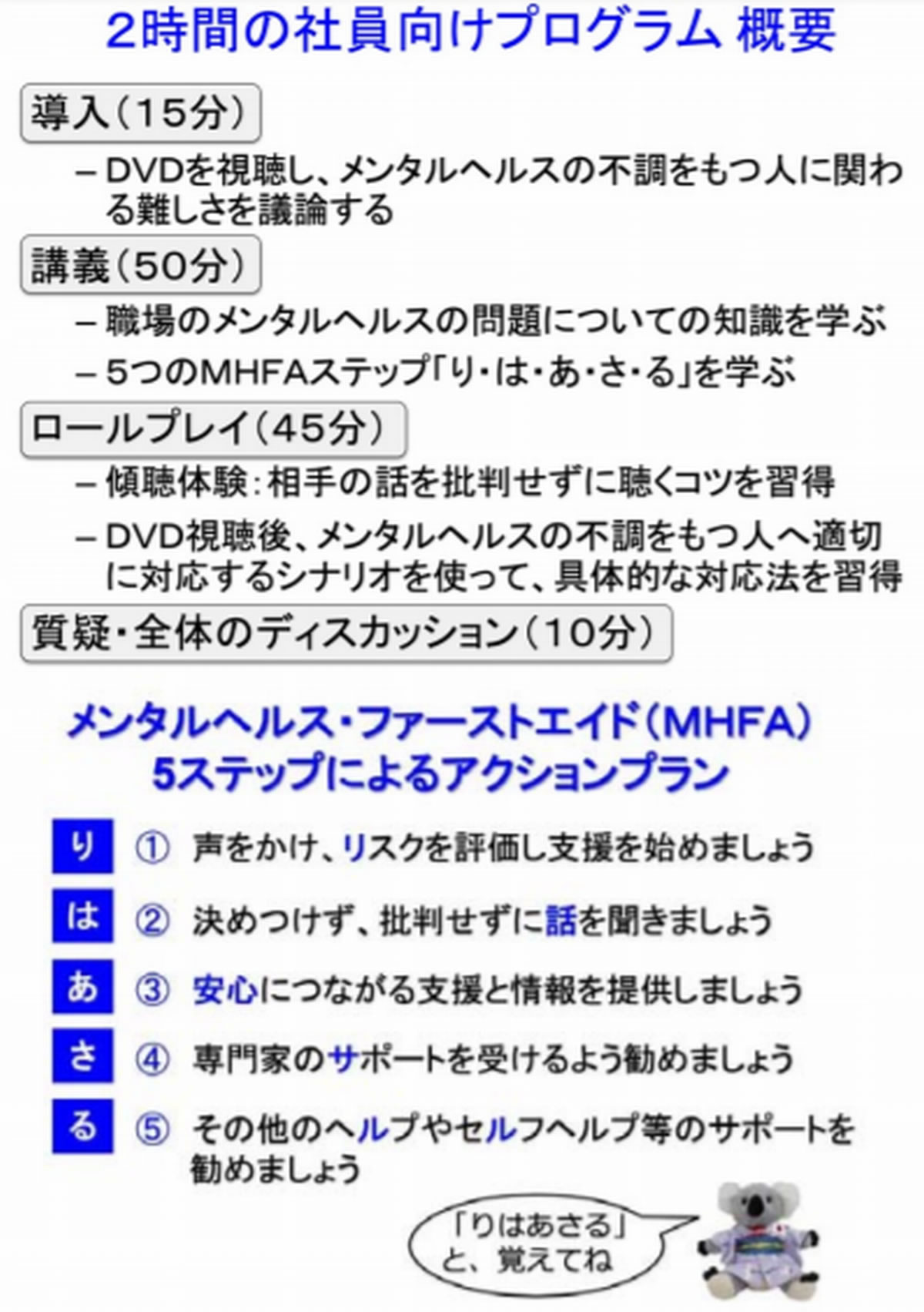 今回、多忙な社員でも受講しやすいように2時間の暫定プログラムを作成しました(中表:プログラム概要)。うつ病に関する知識を得るための講義に加えて、上司役・メンタルヘルスの不調を抱える社員役によって構成されるシナリオロールプレイ演習を通じて、体験しながらMHFAの5原則「り・は・あ・さ・る」(上表)が実践的に身につくプログラムです。