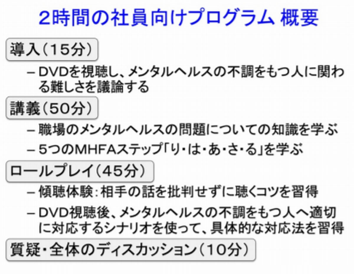 | ※ | メンタルヘルス・ファーストエイド(Mental Health First Aid:MHFA)専門家に相談するまでの間、家族や友人、同僚など身近な人がメンタルヘルスの問題を抱える人に対して行う「こころの応急処置」を実践的に学ぶ教育研修プログラムです。2000 年にオーストラリアで 12 時間プログラムとして開発され、世界中に拡まりつつあります。講義だけでなく、スモールグループでの議論、ロールプレイなど体験型学習によって、具体的な対処法を習得することができます。 |