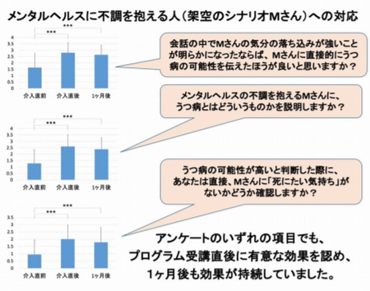日本医療研究開発機構(AMED)・障害者対策総合研究開発事業の支援により、九州大学大学院医学研究院の神庭重信教授(精神医学分野)、加藤隆弘講師(同上)、岩手医科大学の大塚耕太郎教授らを中心とする共同研究チームは、オーストラリアで市民向けに開発されている「メンタルヘルス・ファーストエイド(MHFA)」とよばれる心の応急対応法を基にして、一般企業の社員がメンタルヘルスの不調を抱える同僚や部下に適切に関わるための知識とスキルを具体的に習得可能な2時間の教育研修プログラムの独自開発に取り組んでいます。今回、暫定版のプログラムをパイロット試験として実施したところ、受講者のアンケート結果から、特に不調者へ対応するスキルと自信の向上を認めました。今後、本教育研修プログラムを多くの職場で実施し、実際にメンタルヘルス不調の早期発見・早期治療につながるか、その有効性を検証する予定です。本研究成果は、平成30年12月7日(金)午後2時(米国東部時間)に、オープンアクセスの国際科学雑誌「PLOS ONE」に掲載されました。