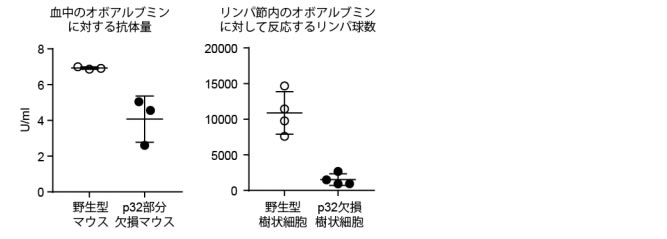 まず、卵アレルギーの原因成分の一つであるオボアルブミンをマウスに投与して、それに対して反応する抗体量とリンパ球の数を解析しました。その結果、野生型マウスと比較して、p32部分欠損マウスにおいてはオボアルブミンに対して反応する抗体の量が有意に減少していました(図1左)。次にこの抗体量の低下が樹状細胞のp32遺伝子の欠損による影響だと考えて、野生型マウスとp32部分欠損マウスからそれぞれ採取した樹状細胞にオボアルブミンを加えて培養した後に野生型マウスに移入しました。予想通り、p32欠損樹状細胞を移入した群において、オボアルブミンに反応するCD8陽性Tリンパ球の数が減少していました(図1左)。これらの結果により、我々は樹状細胞におけるp32遺伝子が卵アレルギーの増悪に関与していると考えました。