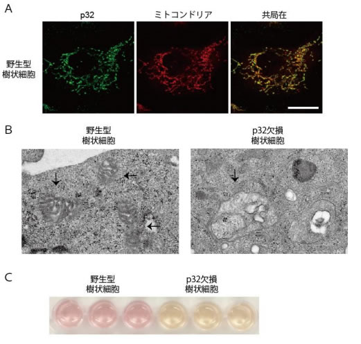 次に我々は、p32欠損樹状細胞の特徴を解析しました。これまでの我々の報告と一致して、p32のたんぱく質はミトコンドリアに局在していました(図 2A)。さらに、p32の遺伝子を欠損させた樹状細胞は、電子顕微鏡においてミトコンドリアの構造そのものが崩壊しており(図 2B)、代謝の変化により細胞培養液の上清が酸性に変化することがわかりました(図 2C)。さらに、糖分を利用して作られる乳酸がp32欠損樹状細胞において増加し、逆にミトコンドリアの代謝が低下していることより、p32遺伝子はミトコンドリア依存的な代謝も制御することが明らかになりました。