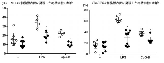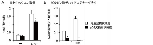 | 図 3:LPS(大腸菌の細胞壁成分)、CpG(非メチル化DNA)を投与した後のMHC(左)、CD40/86(右)の細胞膜表面への発現の割合 さらにその代謝メカニズムを解析するためにLPSを投与した後の樹状細胞の代謝産物を測定しました。160種類程度の代謝産物を測定したところ、p32欠損樹状細胞においてクエン酸の量が低下していることがわかりました(図 4A)。ミトコンドリア内でクエン酸へ変換するための重要な酵素の一つはピルビン酸デハイドロゲナーゼですが、p32 欠損樹状細胞においてこの酵素の活性が低下していました(図 4B)。さらに、我々は直接p32とピルビン酸デハイドロゲナーゼが結合することにより相互作用し、ピルビン酸デハイドロゲナーゼの阻害が樹状細胞の抗原提示能を低下させることを見いだしました。これらの結果により、樹状細胞の活性化において、ピルビン酸デハイドロゲナーゼの活性化が必要であることがわかりました。 |