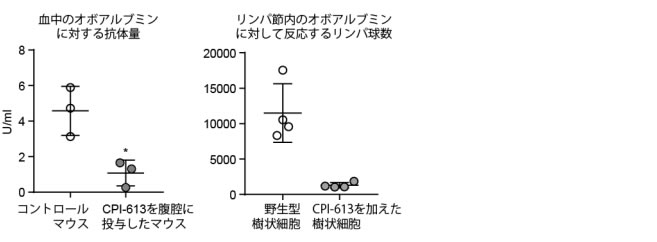 | 図 5:マウスの腹腔にCPI-613を投与した後に、オボアルブミンと免疫賦活剤を投与した後の血中のオボアルブミンに対する抗体量(左)とCPI-613とオボアルブミンを加えて培養した樹状細胞を野生型マウスに投与した後のリンパ節内のオボアルブミンに対して反応するCD8陽性Tリンパ球の数(右) |