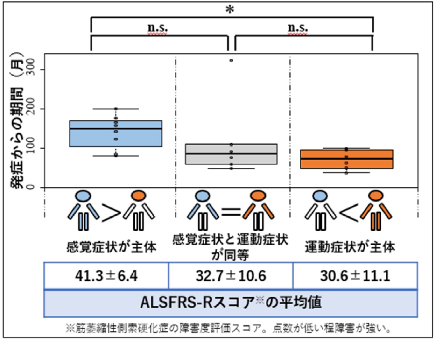 FOSMN患者さんの主体となる症状が感覚症状か運動症状かで分類しました。運動症状が主体となる病型(赤)では、より短い期間で障害が強くなっていることが分かります。