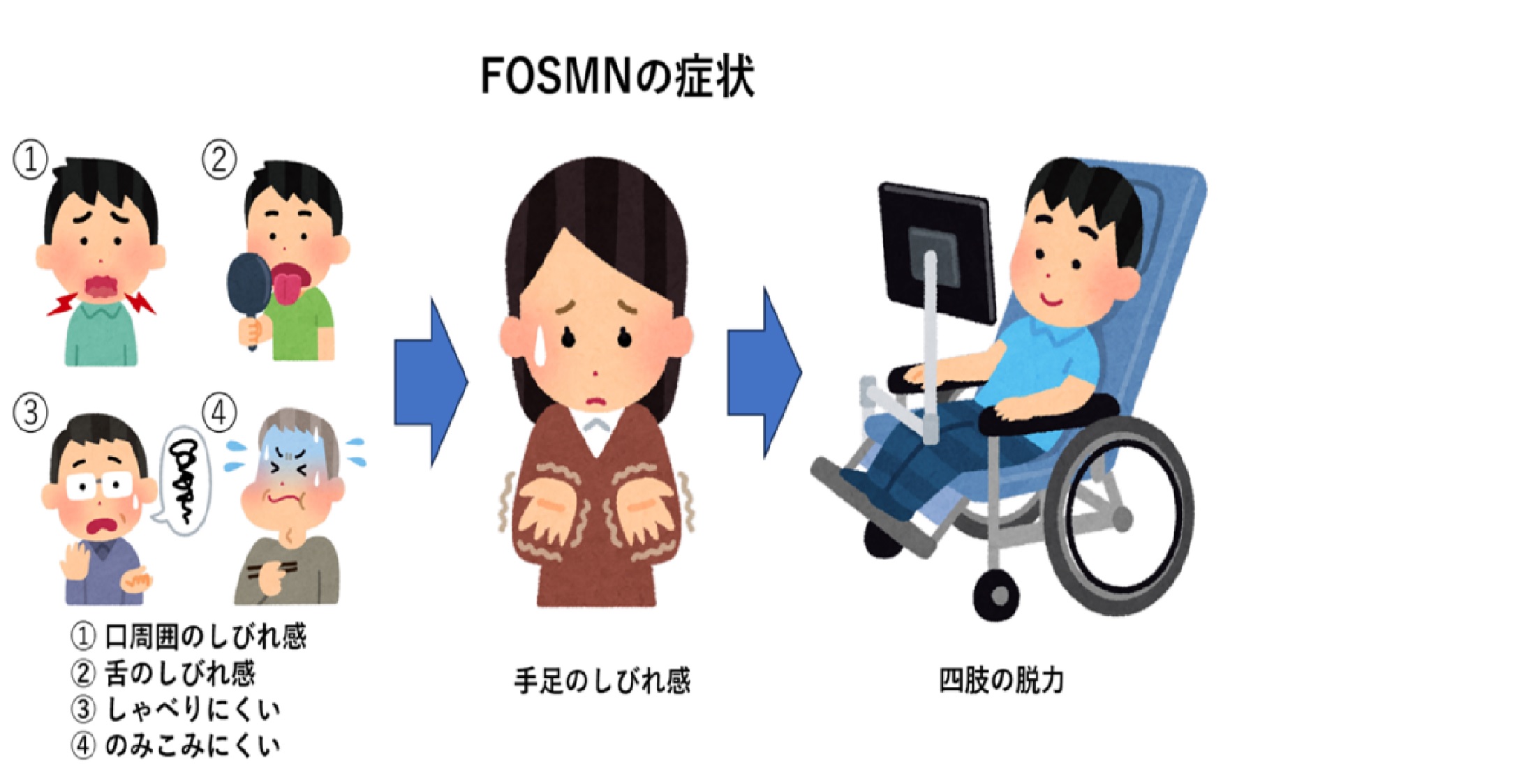 ① 顔面発症感覚運動ニューロノパチー(FOSMN)は徐々に全身の感覚・運動障害が進行する神経疾患ですが、認知度が低く国内