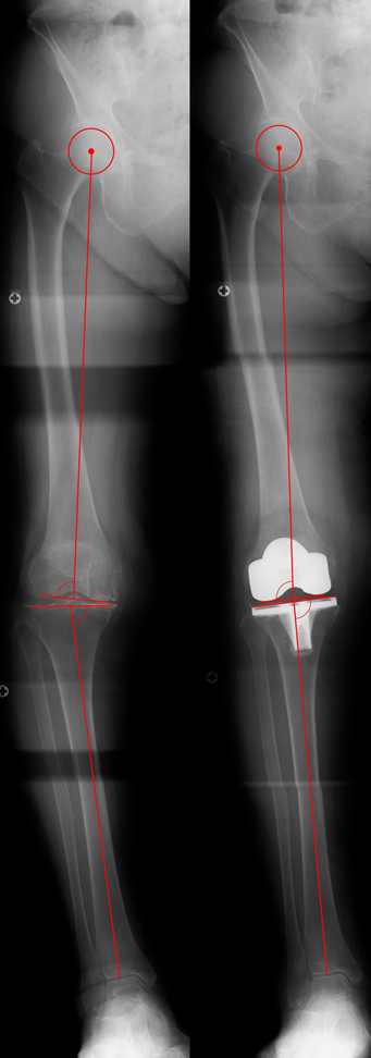 図 1: TKA 前後のレントゲン画像で、術前は O 脚、術後は真っ直ぐに変化している。本例では TKA への違和感があった。