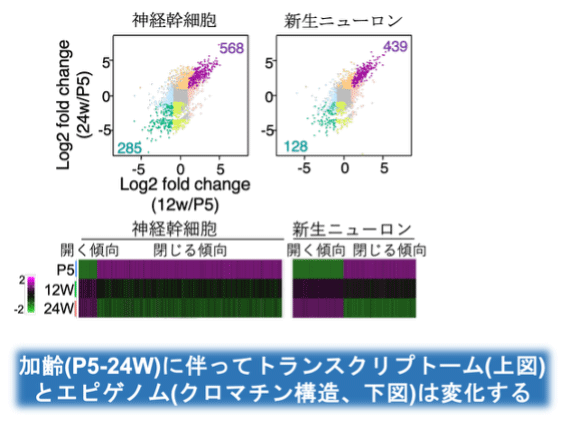 単一細胞解析技術を駆使して、神経幹細胞およびその分化系譜の遺伝子発現 (上図) とエピゲノムの変化 (下図) を時系列的に解析した。その結果、成体マウスの海馬において、神経幹細胞が若年期からすでに老化に似た変化を始めていることを発見した。