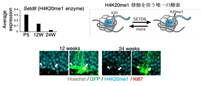 シングルセル解析データを用いて、加齢に伴って、マウスの海馬神経幹細胞において Setd8 の発現が減少し、その結果 H4K20me1 修飾レベルが低下することを見出した。