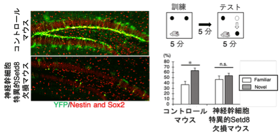 成体の神経幹細胞において特異的に Setd8 を欠損させたマウスでは、YFP 陽性の神経幹細胞が減少 (左図)、その結果ニューロン新生が低下することで、記憶学習障害が認められた (右図)。すなわち、若齢ステージにおいて、早期老化状態に陥ることを発見した。