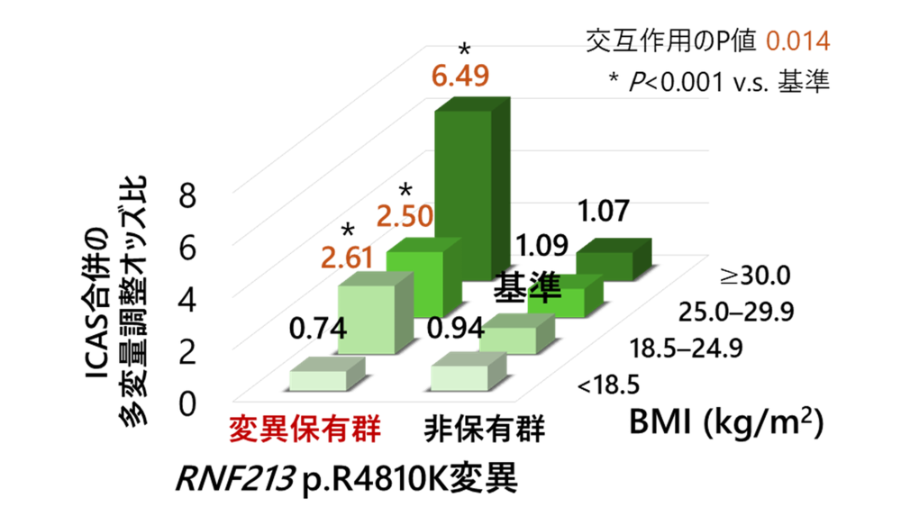 - 本研究により、RNF213 p.R4810K 変異保有者で肥満 (BMI 30以上) を伴う場合、頭蓋内動脈狭窄のオッズ比*3が約6.5倍と著明に高いことが明らかとなりました。