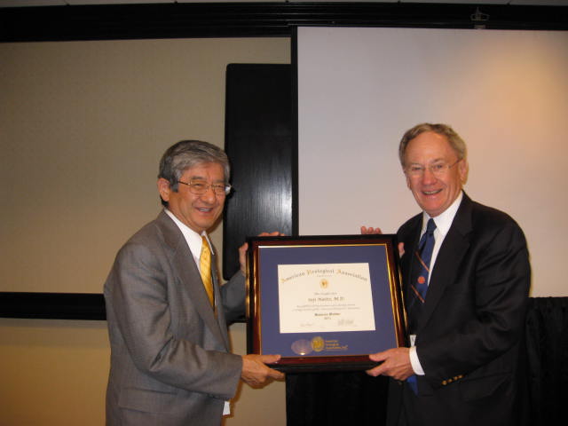 AUA 前理事長の Anton J. Bueschen 先生から名誉会員受賞の盾を受ける  2011年度 AUA 名誉会員のポスター掲示の前で
