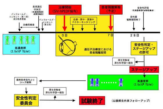 第1ステージ5名において急性期の異常が認められないことを確認した後、第2ステージで15名の被験者にさらに高い濃度のベクターを投与する計画となっています。実際の臨床研究の進捗状況については、九州大学病院眼科ホームページ <http://www.eye.med.kyushu-u.ac.jp/> にて随時公表を予定しています。