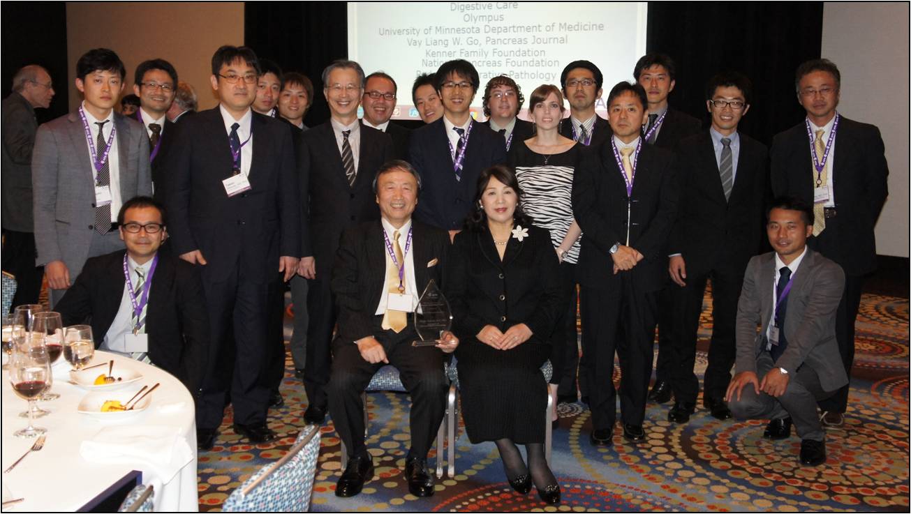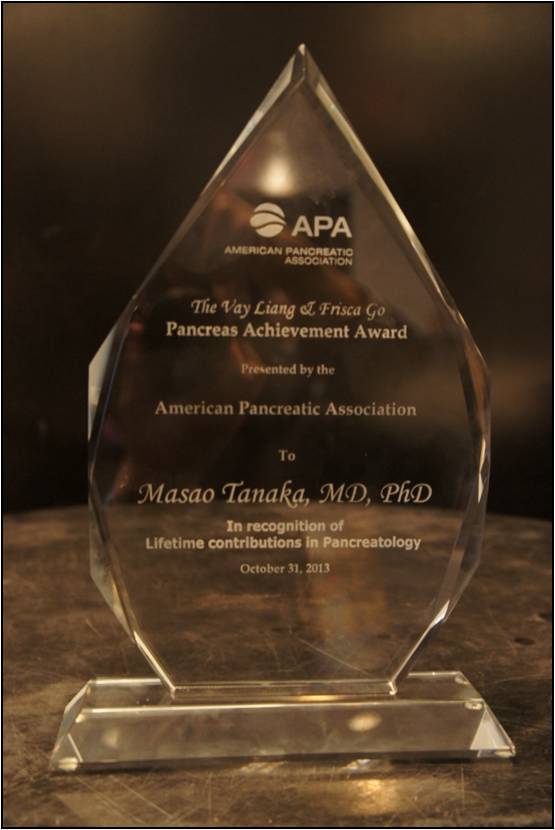 2013年10月30日から11月2日に米国フロリダ州マイアミで開催された第44回米国膵臓学会(APA; American Pancreatic Association)年次大会で、臨床・腫瘍外科の田中雅夫教授が2013年度Lifetime Achievement Award (Vay Liang & Frisca Go Award)を受賞されました。この賞は膵臓病学の発展に顕著な功績があった者に贈られる、膵臓病学分野では世界で最も権威ある賞です。これまで日本人の受賞は田中教授を含めて3名しかおられません。
