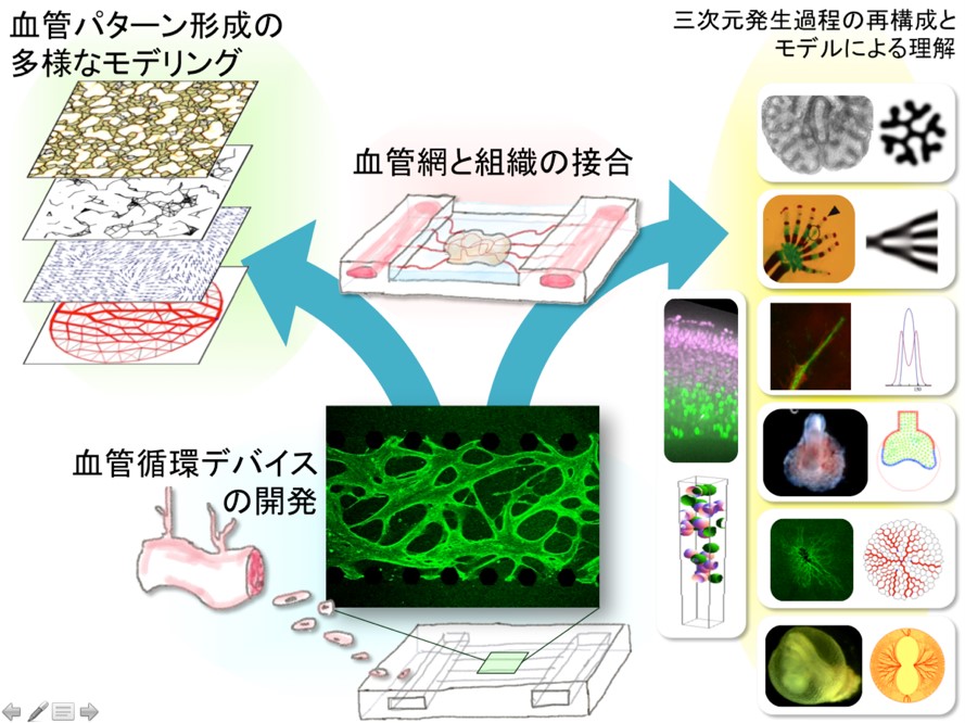 我々の体は、細胞同士が複雑な相互作用をすることで出来上がっています。このかたちづくりの原理を解明するためには、細胞の性質を数理モデル化で理解し、これを用いて細胞が組織構造を作り上げる過程を体の外で再構成することが最も確実な証明になります。我々は、還流可能な毛細血管網デバイスをキーテクノロジーとして、様々な器官の三次元組織構造を体の外で作らせ、生命の形づくりのメカニズムの解明を飛躍的に進めることを目標とします。