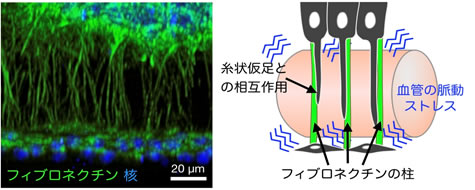 フィブロネクチンは力学的要因によって重合を促進されることが知られています。我々は血管が脈動することで生まれる伸縮ストレスがフィブロネクチンの「柱」を形成させる力学因子であると予想し、血管形成阻害、心拍停止、局所的血栓誘導など様々な角度から実験を行い、血管の脈動がフィブロネクチン柱の形成維持に必須であることを明らかにしました。さらに本研究から、フィブロネクチンが近傍の細胞の糸状仮足とインテグリン受容体を介して相互作用し、細胞移動や分化に関わることがわかりました。本成果は、血管周囲のメカニカルストレス受容機構の解明に発展することが期待されます。