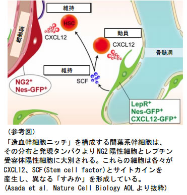 幹細胞は、生物のあらゆる細胞、臓器を形成する能力をもつ細胞です。生物は、発生初期の一つの細胞つまり幹細胞から生まれます。近年の研究により胎児期だけでなく成人のあらゆる臓器にも、その臓器を再生する能力がある「臓器特異的幹細胞」の存在がわかってきました。これらの細胞は、生涯にわたって無限に増殖する能力を維持しており、通常その増殖は厳格な制御をうけ、多くの細胞は「眠った状態」で存在し、臓器が傷害を受けた時など必要に応じて増殖し、分化します。幹細胞は、特殊な環境下でのみ「眠った状態」のままでいることができ、その環境(すみか)が「ニッチ」と呼ばれています。 我々の血液にも、赤血球、白血球、血小板といったすべての血液細胞を作る元になる細胞が存在し、「造血幹細胞」と呼ばれています。造血幹細胞は、骨髄に主に存在しており、骨などの元になる間葉系幹細胞がその「ニッチ」細胞として知られておりましたが、その詳細なメカニズムは、 わかっておりませんでした。今回のこの発見は、造血幹細胞の効率的な増幅法の開発、ひいては再生医療の加速に貢献すると期待されます。 本研究成果は、2017年2月20日(月)午後4時(英国時間)に「Nature Cell Biology」電子版に公開されました。 |