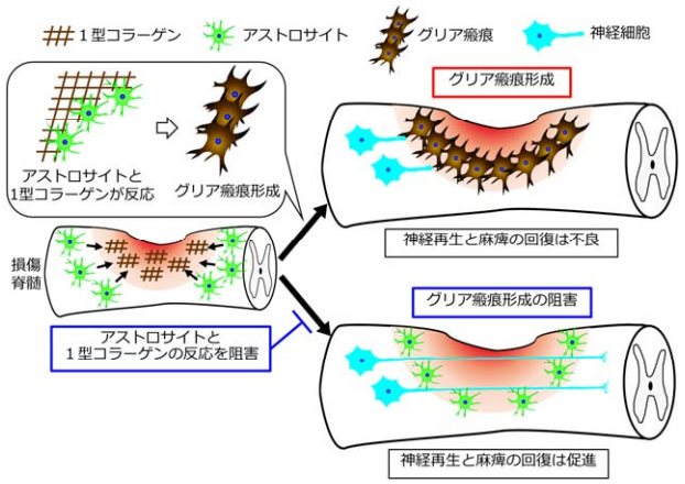 本研究グループはセルソーターという装置を用いて損傷を加えた脊髄からアストロサイトを選択的に回収し、再度正常な脊髄に移植することで、グリア瘢痕が形成される反応は一方通行ではなく、アストロサイトが置かれた環境によって変化するものであることを証明しました。特に、アストロサイトが1型コラーゲンと反応してカドヘリンという細胞接着因子を発現させることでグリア瘢痕が形成されることを明らかにしました。さらに、この反応を阻害して脊髄損傷後のグリア瘢痕の形成を抑えると、損傷部を越えた神経再生が起こり、麻痺の回復が促進されることを発見しました。本成果により、今後、グリア瘢痕形成をターゲットとした新しい中枢神経損傷の治療開発が期待されます。