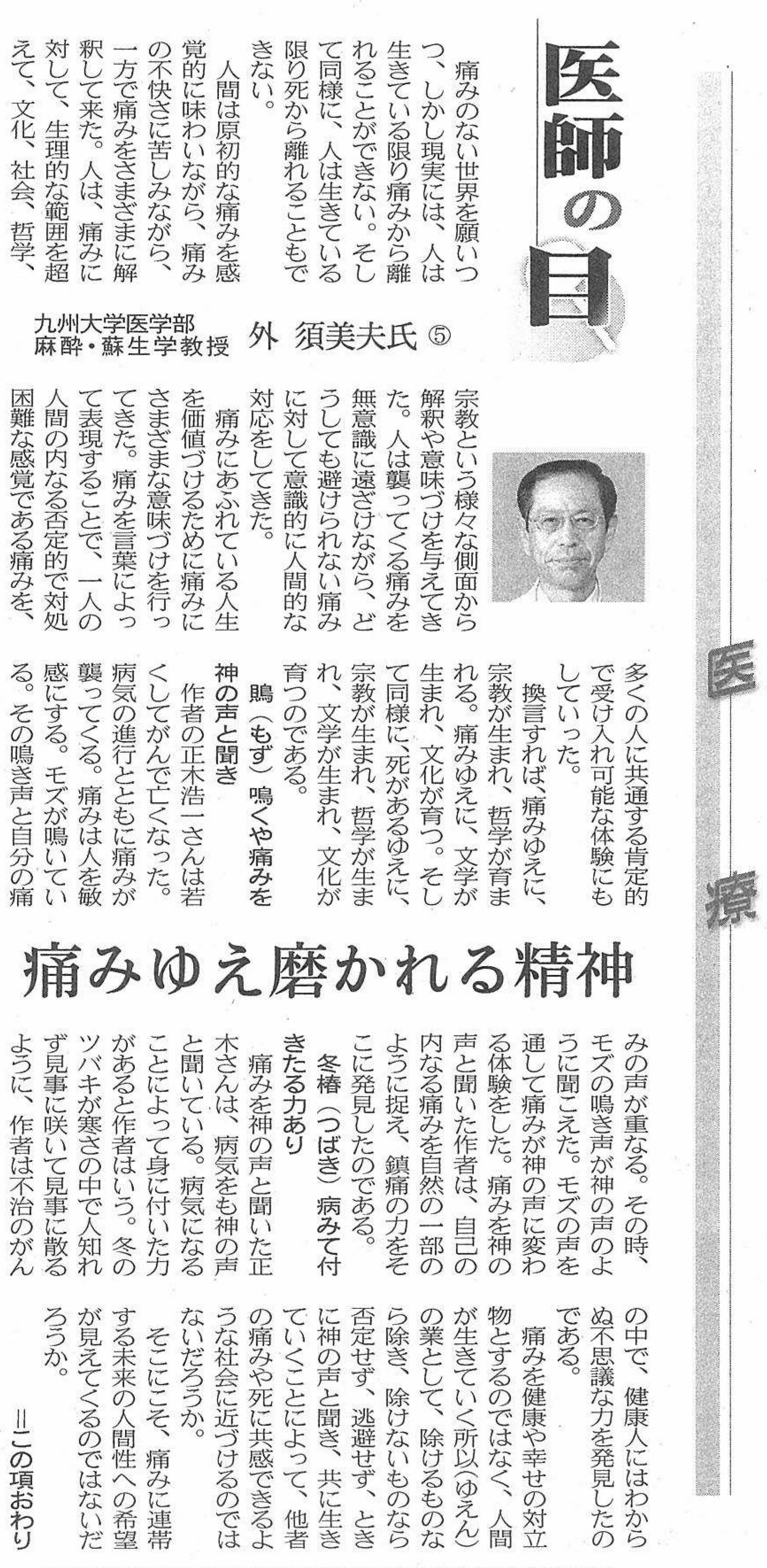 日本経済新聞 2012年9月20日(木)夕刊「医師の目 痛みゆえ磨かれる精神」から、日本経済新聞社様の許諾を得て転載しています。無断複製転載することは禁止致します。