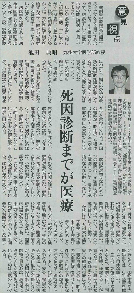 「意見視点 死因診断までが医療」 法医学分野 池田典昭教授
