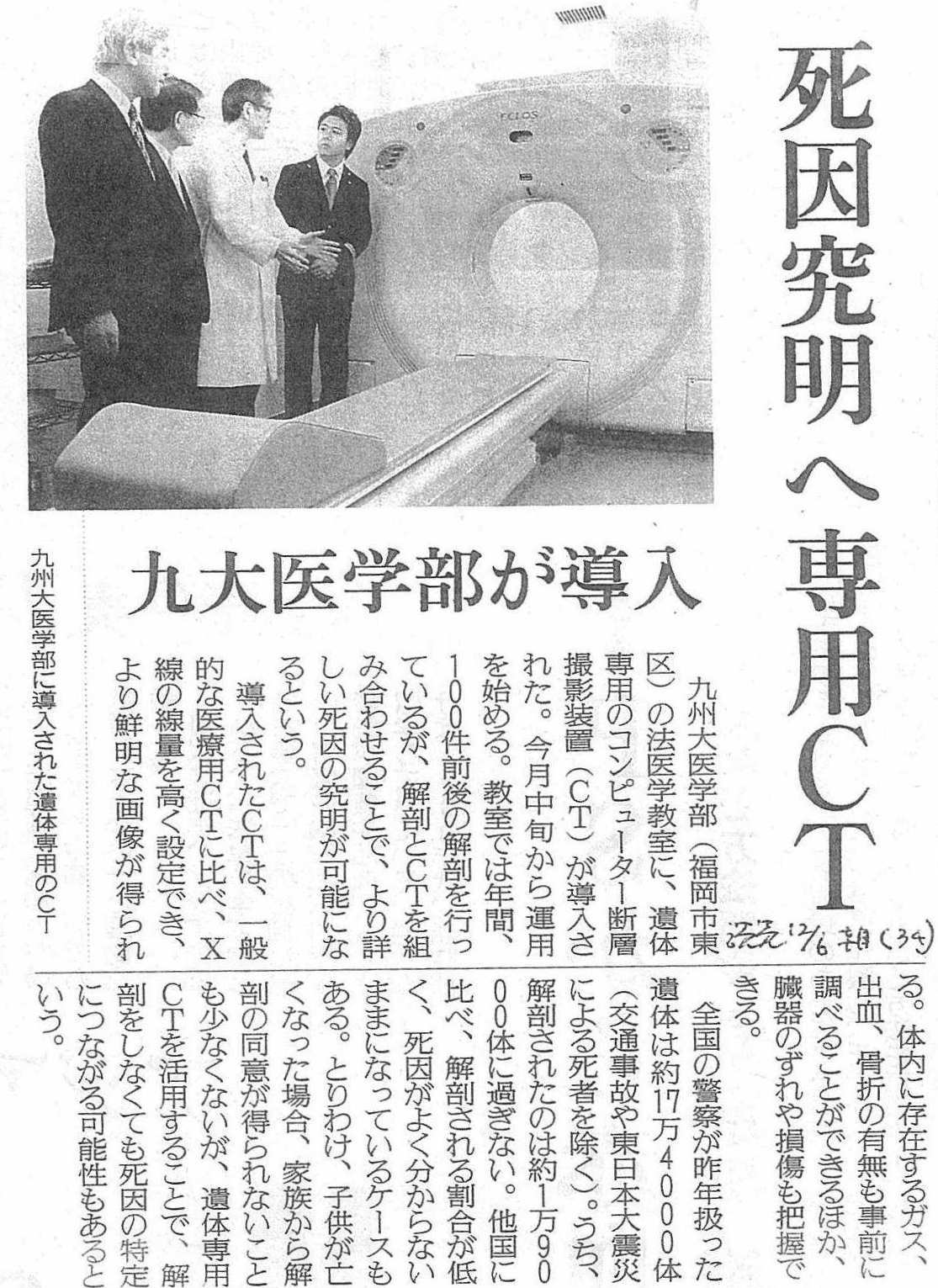 2013年12月6日 読売新聞 朝刊 「死因究明へ専用CT 九大医学部が導入」を、読売新聞社の許諾を得て転載しています。無断複製転載することは禁止致します。