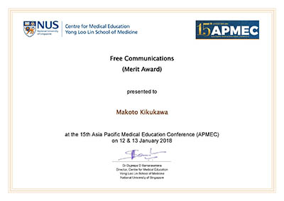 第15回 となるAPMECは2018年1月10~14日にシンガポールで開催され、菊川講師は12日に「Understanding the Response Process of Residents Evaluating Clinical Teachers -influences of instrument and national culture-」(臨床指導医を評価する研修医の思考プロセスを理解する - 評価表と文化の影響 -)のテーマで発表を行い、Merit Awardを受賞しました。