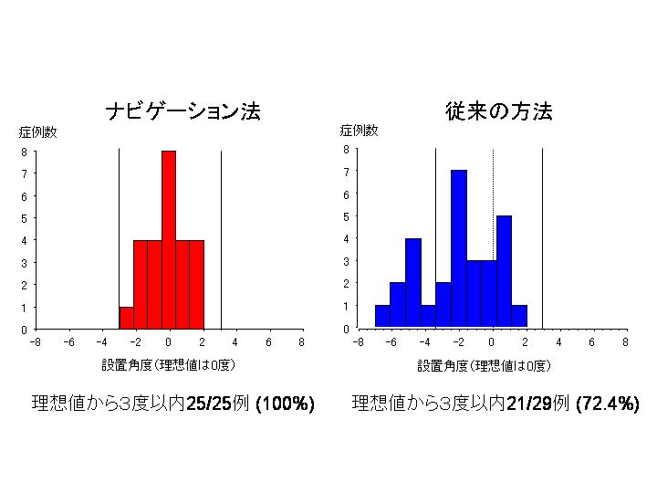 これまでの臨床例から、従来型の手術の場合に3度以内の誤差は7割強だったが、患者さんの了解を得てコンピュータ・ナビゲーションシステムを使用した場合は、すべて3度以内だった(図参考) 。まだ臨床研究の段階で、コストの問題もあってナビゲーションの設置病院は九大病院など限られている。松田講師は「まだすべての症例で理想の誤差1度以内にというわけには行かないので、改良点やロボットによる切骨なども検討していきたい」という。