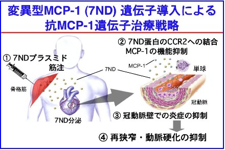 動脈硬化性疾患は、欧米では死亡率が最も高く、日本でもがんに次いで高い。動脈硬化は加齢やコレステロールなど多くの要因から、血管に炎症が起きることが知られる。それに関わっているのが、本来は免疫の役目をする白血球の一種の単球・マクロファージだ。医学研究院の江頭健輔助教授(循環器内科学)は、その単球を活性化させる因子・MCP-1の働きを抑制することによって、炎症を防ごうと考えた。世界に先駆けて成功した抗MCP-1遺伝子(7ND遺伝子)の開発だ。サルを使った実験でも、筋肉注射によってこの遺伝子を導入して動脈硬化を抑えることが分った。