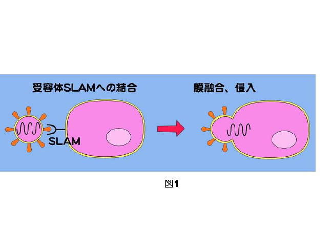 1)麻疹ウイルスのゲノム遺伝子がSLAMを介して細胞に侵入する(図1)。