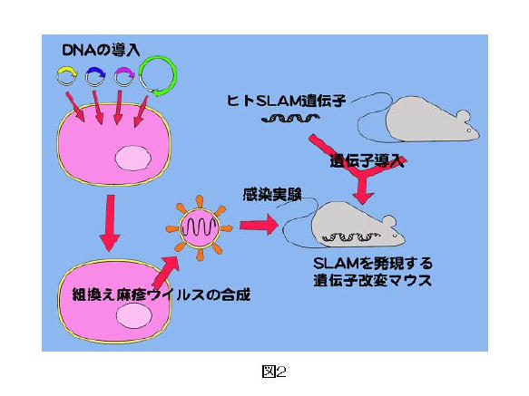2)ヒト化マウス(ヒトのSLAMを持つマウス)を使って、様々な遺伝子組み換えウイルスの感染状況を調べる(図2)。