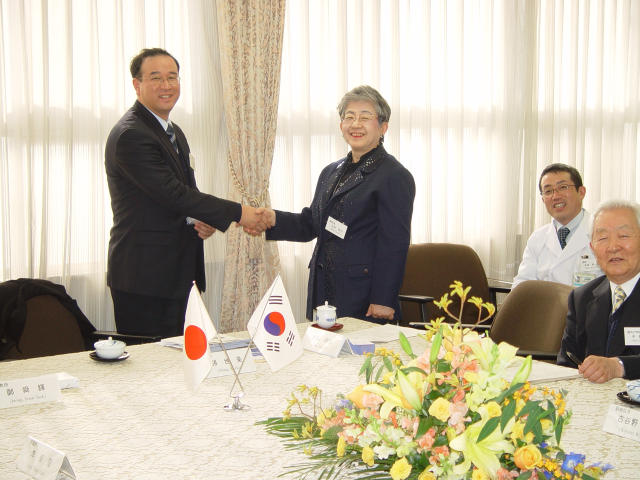 〈写真説明〉交流のために九州大学病院を訪れた韓国慶尚大学校病院の張世昊・研修団長(左)と握手する水田祥代・九州大学病院長(2005年12月6日)