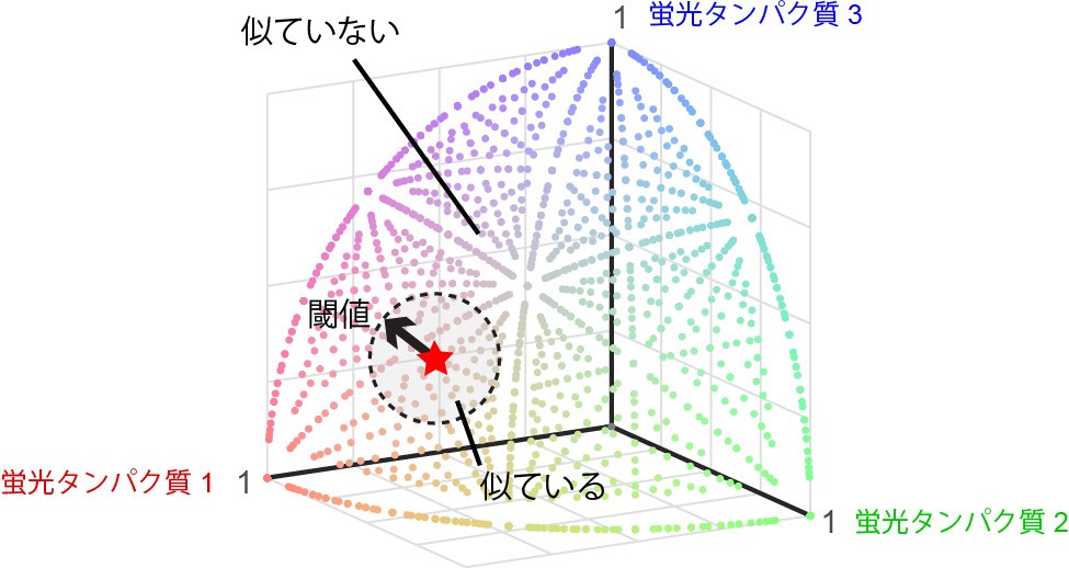 3原色を例にとって、色の類似度を定義する。色について評価するうえでは、輝度情報を揃える必要があるため、赤・緑・青を合わせた輝度を1にそろえる(規格化)。すると、全ての色は球の表面に展開される。ここで、色が近いとは、平面上の距離が近いということである。この表面上で一定の距離以上に離れている色どうしは別の色であると判断する。同じ神経細胞に由来する神経突起断片は、同じ色の組み合わせで標識されているため、それぞれの色情報は、この表面上で近くにまとまって分布するはずである。dCrawler法を用いると、距離が一定の閾値未満のものをグループ化することができる。QDyeFinderでは7原色で表現された神経突起の色情報を同様の手順でグループ化し、同じ神経細胞由来の神経突起どうしをクラスター(一つの神経細胞)としてまとめることができる。
